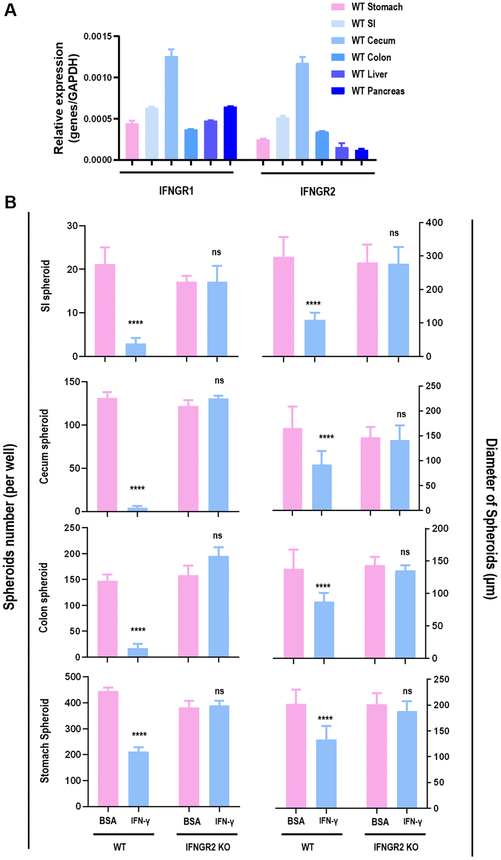 IFNγ effectively reduced the amount and size of spheroids originated from SI (p < 0.001), cecum (p < 0.001), colon (p < 0.001), and stomach (p < 0.001), but not from liver and pancreas (Figure 2, Supplementary Figures 3, 4). Since the organoids were most sensitive to IFNγ treatment, and morphologies of these organoids were normal even under 5 ng/ml IFNγ treatment (as visualized in Figure 2), samples collected for RT-PCR were considered healthy. The RT-PCR results revealed substantially lower level of IFNGR2 but not IFNGR1 in liver and pancreas spheroids as compared with those of SI, cecum, colon, stomach spheroids (Figure 3A). Knocking out IFNGR2 rendered cells irresponsive to IFNγ treatment in spheroids of SI, cecum, colon and stomach (Figure 3B, Supplementary Figure 5), suggestive of the role of the IFNγ/IFNGR2 axis in mediating the observed detrimental effects on SI spheroids as well as those from cecum, colon and stomach.