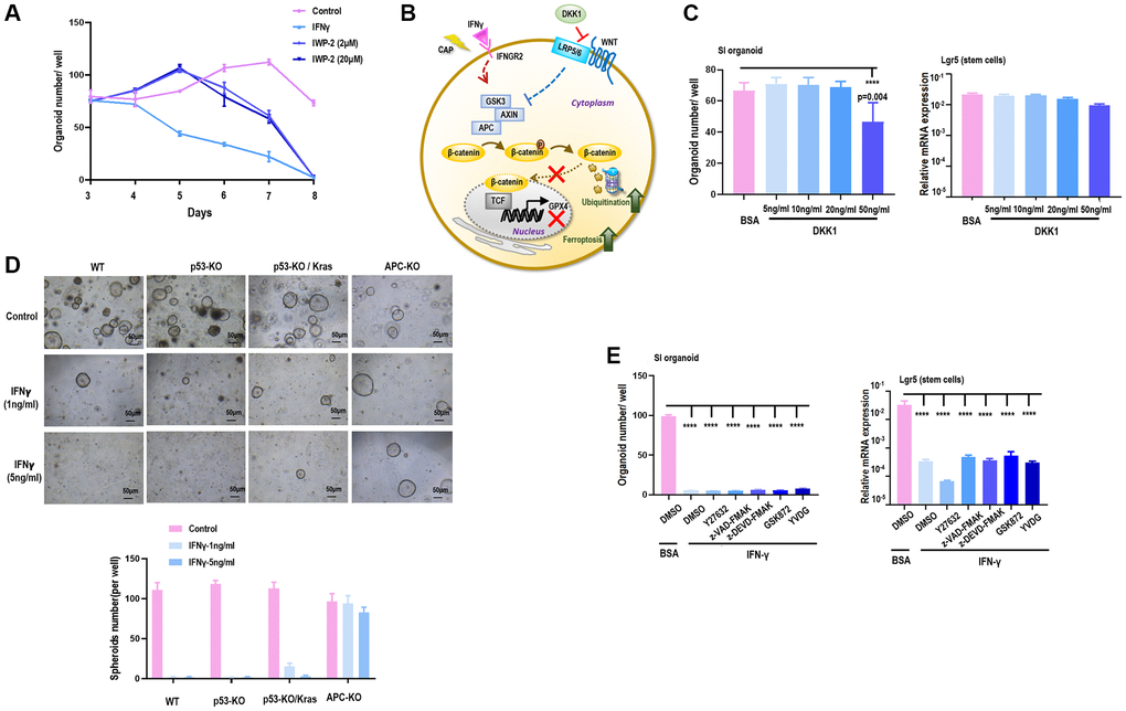 Supplementing SI cells with DKK1, a Wnt signaling inhibitor that binds LRP6 and thus blocks interactions between LRP5/6 and Frizzled [22] (Figure 4B), under varied doses (5 ng, 10 ng, 20 ng, 50 ng) did not alter the amount of SI organoids nor Lgr5 expression (Figure 4C), suggesting that SI organoid reduction was independent of the binding between LRP5/6 and Frizzled in Wnt signaling. Next, we constructed SI cells carrying deficient p53 and over-activated Kras (p53-KO/Kras), SI cells with p53 being knocked out (p53-KO), and SI cells lacking APC expression (APC-KO) (Supplementary Figure 6). By supplementing these genetically modulated cells with 1 ng/ml or 5 ng/ml IFNγ, IFNγ significantly reduced the amount of SI spheroids when p53 was knocked out independent of the status of Kras, but such a reduction was observed when APC was knocked out (Figure 4D), suggestive of the involvement of APC in IFNγ/IFNGR2-mediated organoid damage. APC is a multi-functional tumor suppressor gene that suppresses the canonical Wnt pathway via forming the complex with AXIN and GSK3, where the APC-AXIN-GSK3 complex inhibits Wnt signaling via promoting β-catenin ubiquitination [23]. These evidences altogether suggest that IFNγ/IFNGR2 may act through maintaining a persistent formation of APC with AXIN and GSK3.