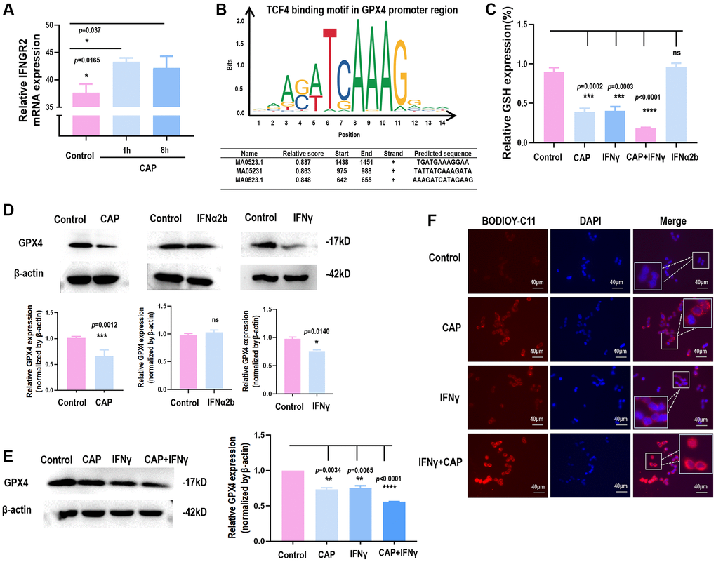 Several studies have reported the role of CAP in inducing cancer cell ferroptosis [33–35], consolidating our hypothesis on the regulatory role of β-catenin on GPX4 through forming complexes with TCF. Through transcription factor binding site prediction using JASPAR [36], TCF4, a member of TCF family, was found to transcriptionally bind to the promoter region of GPX4 (Figure 5B). In the canonical Wnt pathway, the activity of β-catenin is predominantly mediated by TCF4, a member of the TCF family transcription factors [37]. In addition, we found that either CAP or IFNγ reduced GPX4 protein expression (Figure 5C) and GSH level (Figure 5D), but the same effect was not observed when IFNα was used (Figure 5C, 5D). IFNγ created synergy with CAP in reducing GSH level (Figure 5D), GPX4 protein expression (Figure 5E), and lipid peroxidation (Figure 5F), suggestive of their synergized efficacy in triggering GPX4-dependent ferroptosis.