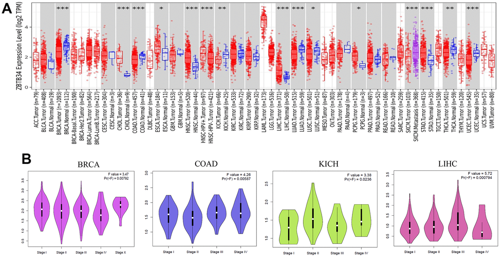 ZBTB34 was inputted in the TIMER2 web (http://timer.cistrome.org/). The expression difference of ZBTB34 between the tumor and adjacent normal tissues across different tumors was observed. Additionally, we used the “Pathological Stage Plot” module of the GEPIA2 web server (http://gepia2.cancer-pku.cn/#analysis) to obtain violin plots of the ZBTB34 expression in different pathological stages (stage I, stage II, stage III, and stage IV). The log2 [TPM (Transcripts per million) +1] transformed expression data were applied for the box or violin plots.