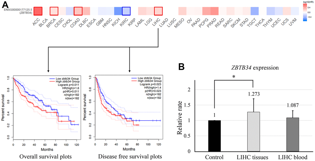 According to the ZBTB34 expression levels, we divided the cancer cases into high-expression and low-expression groups. Overall survival (OS) was measured from the date of the study, until the date of death or date last known alive [14]. Disease-free survival (DFS) is defined as the time from randomization to recurrence of tumor or death, and it is typically used in the adjuvant treatment setting [14]. Highly expressed ZBTB34 was associated with a poor prognosis of overall survival for adenoid cystic carcinoma (ACC) (P=0.00068), BRAC (P=0.038), COAD (P=0.013), and LIHC (P=0.011), as seen in the survival map of all tumors in Figure 2A. Lowly expressed ZBTB34 was associated with the poor prognosis of kidney renal clear cell carcinoma (KIRC) (P=0.00048). The correlation between ZBTB34 expression and LIHC in these five tumor types is consistent with the finding of gene expression analysis (Figure 1A). It indicates that the relationship between LIHC and ZBTB34 is supported by the evidence from bioinformatics analysis. The altered expression of ZBTB34 was also correlated with LIHC survival (Figure 2A). We then decided to conduct additional research to explore the relationship between ZBTB34 and LIHC. We collected blood samples from 21 Chinese LICH patients and 11 healthy individuals. We also collected cancer tissues and paracancerous tissues from 16 Chinese LIHC patients. Since ZFPs generally are housekeeping transcription factors that are constitutively expressed in cells and are essential for basic cellular functions, ethnicity shouldn’t be a significant factor affecting the analysis results [15]. The qPCR results showed that ZBTB34 expression was significantly higher in LICH tissue (P=0.010) compared to control, but not in peripheral blood (P=0.114) (Figure 2B). It implies that ZBTB34 is a putative oncogene that contributes to the development of LIHC.