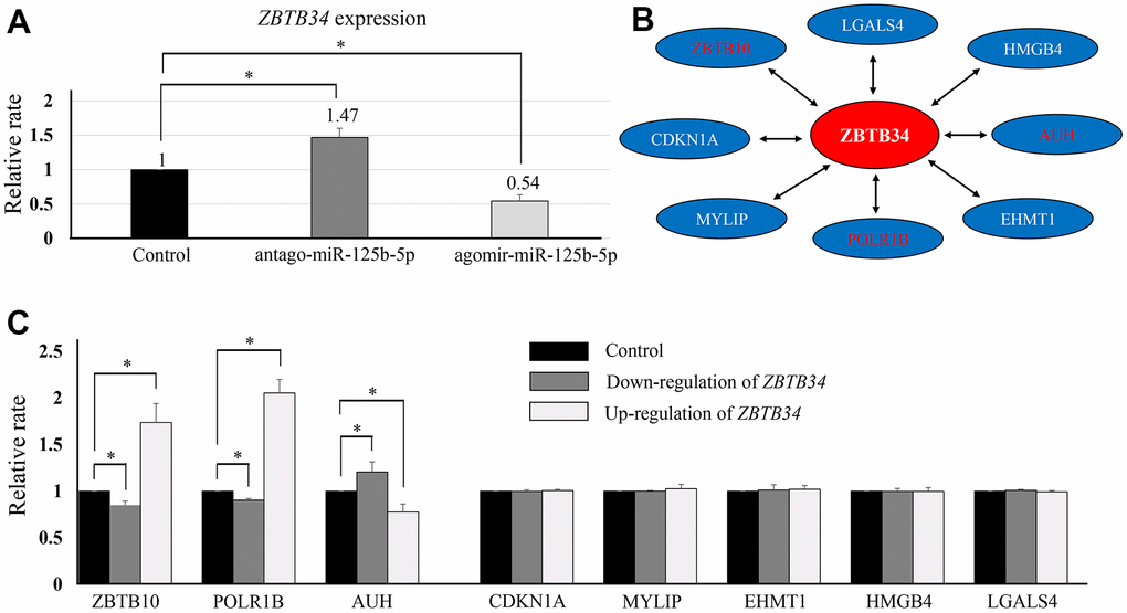 miR-125b-5p/ZBTB34/ (ZBTB10, POLR1B, and AUH) signaling axis