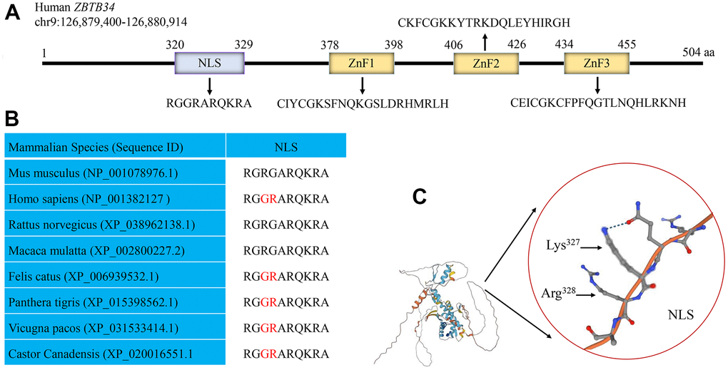 NLStradamus is a hidden Markov model that accurately predicts localization signal sites [19]. The position weight matrices (PWM) predict DNA binding sites for Cys2His2 Zinc Finger Proteins [20]. By using the NLStradamus and the batch PWM software, a putative NLS sequence (320RGGRARQKRA329) and three ZnF domains were discovered within ZBTB34 (Figure 4A). The alignment of the amino acid sequences of Mus musculus, Homo sapiens, Rattus norvegicus, Macaca mulatta, Felis catus, Panthera tigris, Vicugna pacos, and Castor canadensis showed that the amino acids of NLS were highly conserved (Figure 4B). AlphaFold is an automated intelligence system developed by DeepMind that makes accurate predictions of a protein’s structure based on its amino-acid sequence [21]. Using the AlphaFold proteins structure database, the 3D structure of NLS on the ZBTB34 (UniProt: A0A0C4DFQ2) was identified (Figure 4C).