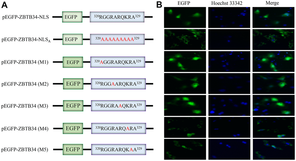 ZBTB34 accumulated in the nuclei of the transfected cells when the pEGFP-ZBTB34 was transfected into HepG2 cells, demonstrating that ZBTB34 is a nuclear protein (Figure 5A). Alanine-scanning mutagenesis is a straightforward and widely used method for determining the catalytic or functional role of protein residues [22]. The alanine scanning method takes advantage of the fact that most canonical amino acids can be exchanged with Ala by point mutations, while the secondary structure of mutated protein remains intact, as Ala mimics the secondary structure preferences of the majority of the encoded or canonical amino acids. The pEGFP-ZBTB34-NLSA (Ala substitution of the NLS) was constructed in order to experimentally validate the NLS sequence (320RGGRARQKRA329) of ZBTB34 (Figure 5B). After transfecting the pEGFP-ZBTB34-NLSA into HepG2 cells, the green fluorescence emitted by EGFP was seen from the cytoplasm but not from the nucleus (Figure 5B). The loss of the NLS sequence caused a diffusion of ZBTB34 into the cytoplasm, in other words, abolished its nuclear entry ability.