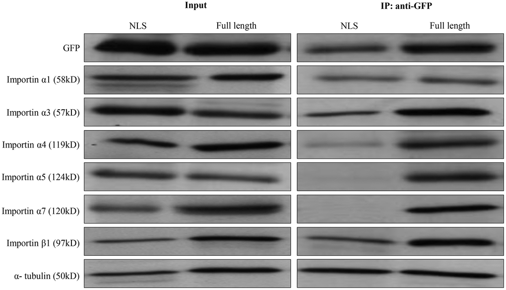 Cells were lysed for 1 hour on ice with NP-40 lysis buffer. Protein samples were separated by 10% SDS-PAGE. After electrophoresis, the separated proteins were transferred to a 0.45 μm nitrocellulose membrane. The membranes were blocked with 5% fat-free milk in PBS buffer for 1 hour at room temperature. After washing three times with PBS containing 0.1% Triton X-100, the membranes were incubated with antibodies in PBS with 0.1% BSA at 4° C overnight. Then, it was hybridized with horseradish peroxidase-conjugated secondary antibodies. Signals were developed by using an efficient chemiluminescence kit Enhanced (Proandy, Xi’an, China). The anti-GFP (No. D191040), anti-α-tubulin (No. D191049), anti-importin α1 (No. D194828), anti-importin α4 (No. D222548), anti-importin α5 (No. D197299), anti-importin α7 (No. D161794), anti-importin β1 (No. D197274) were purchased from Sangon Biotech, Shanghai, China. The anti-importin α3 (No. MABS1326) was purchased from Sigma-Aldrich, China.