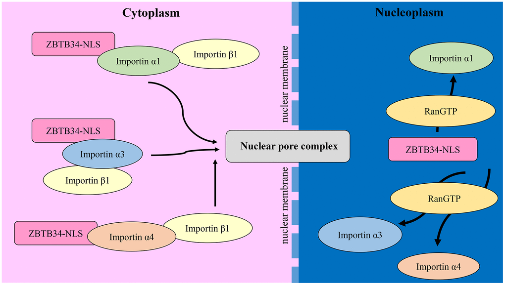 NLS-containing protein is recognized by one or more importin α members, which in turn is recognized by the importin β to help cargo protein enter the nuclear. We performed co-immunoprecipitation with Western blotting experiment and found that importins α1, importin α3, importin α4, and importin β1 were co-immunoprecipitated with ZBTB34 (Figure 6). These results indicated that nuclear import of ZBTB34 in HepG2 cells was mediated by importin α1, importin α3, importin α4, and importin β1.