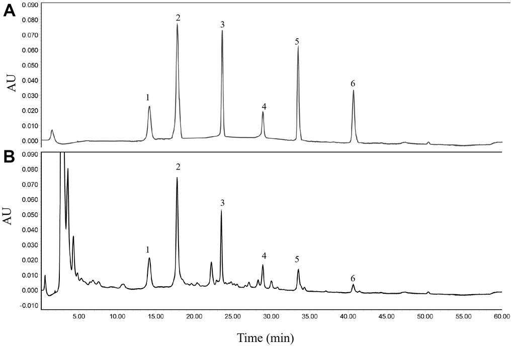 Firstly, six major ingredients in HGWD extract were identified for the quality control using HPLC-UV method, including paeoniflorin, calycosin-7-O-β-D-glucoside, ononin, calycosin, cinnamic acid, and formononetin. The chromatographic condition was optimized, and representative chromatograms of standard compounds and HGWD extract was presented in Figure 1A, 1B. With the validated HPLC-UV method, the concentrations of paeoniflorin, calycosin-7-O-β-D-glucoside, ononin, calycosin, cinnamic acid, and formononetin were determined to be 1.9728, 0.1134, 0.0741, 0.0129, 0.0325, and 0.0056 μg/mg, respectively, in HGWD extract.