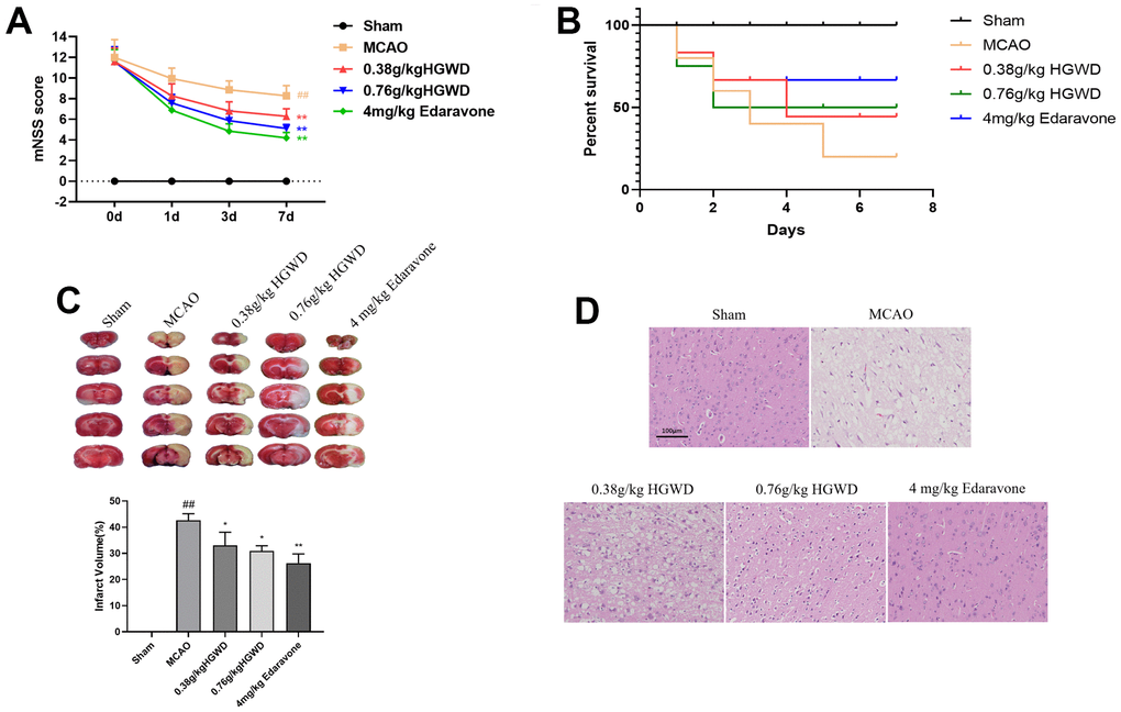 Next, we determined the neuroprotective effects of HGWD in vivo. MCAO model rats were established, and modified Neurological Severity Score (mNSS) was applied to evaluate the neurological behavior of rats at day 1, 3, and 7 after MCAO. As presented in Figure 2A, 2B, rat in the MCAO group showed the highest mNSS scores and low survival rate, while HGWD and edaravone treatment significantly attenuated the neurological deficits in MCAO rat. Meanwhile, MCAO/R performance caused notably increased infarct volume according to the TTC staining (Figure 2C). A significant reduction of infarct volume was observed in rats administrated with HGWD at doses of 0.38 and 0.76 g/kg, from 42.65 ± 2.48% to 33.08 ± 4.96%, and from 42.65 ± 2.48% to 30.95 ± 1.95%, respectively, when compared with the MCAO model group (Figure 2C). Besides, we examined the histopathological changes in the ischemic brain section by HE staining. The results showed that HGWD exhibited a protective effect against tissue injury, characterized by less degeneration and necrosis of nerve cells (Figure 2D). These above data suggest that HGWD can relieve cerebral injury induced by MCAO.