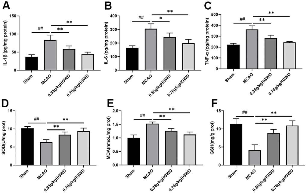 To understand the effects of HGWD on inflammatory response, we measured the levels of inflammatory cytokines such as IL-6, TNF-α, and IL-1β using ELISA kits. The results displayed that, compared with the sham group, MCAO can distinctly enhanced the release of TNF-α, IL-1β, IL-6 in the brain. HGWD treatment can obliviously inhibit inflammation in MCAO rat (Figure 3A–3C). Additionally, we investigated the effect of HGWD on the oxidative stress mediators, including SOD, MDA and GSH in the brain tissue. As Figure 3D–3F displayed, MCAO rats presented reduced SOD and GSH levels while promoted MDA level. However, HGWD at doses of 0.38 and 0.76 g/kg decreased the elevation of MDA and enhanced SOD and GSH levels. These data indicated that HGWD could weaken inflammatory and oxidative stress responses in rats with MCAO.