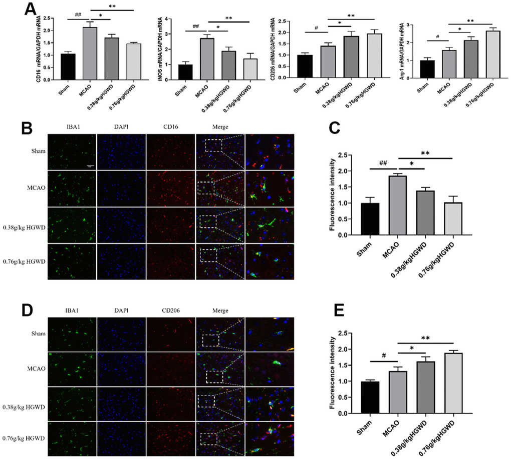 Many evidences have highlighted the important role of microglia M1/M2 polarization in the progression of inflammation in cerebral injury. Therefore, we investigated whether the neuroprotective effects of HGWD were associated with altered microglia polarization. qRT-PCR experiments revealed the elevated expression of M1-like markers (CD16 and iNOS) and M2-like markers (CD206 and Arg-1) in the ischemic brain of MCAO rats (Figure 4A). However, HGWD could shifted microglia polarization towards M2 phenotype, decreasing CD16 and iNOS expression but increasing CD206 and Arg-1 expression, compared with MCAO model group. Double immunostaining further confirmed that the number of CD16+ M1 microglia and CD206+ M2 microglia were both significantly increased in the brain of rat after MCAO (Figure 4B, 4C). Consistent with qRT-PCR results, HGWD could decreased number of CD16+ M1 microglia while increased CD206+ M2 microglia, suggesting that HGWD promoted M2 polarization in MCAO rats.