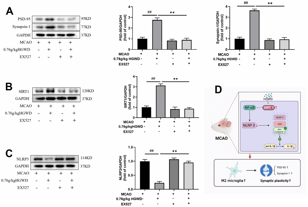 Finally, we further explored the role of Sirt1 in the therapeutic effect of HGWD. Sirt1 specific inhibitor EX527 (10mg/kg) was injected into the subarachnoid space prior to MCAO operation. As shown in Figure 7A–7C, the infarct volume and mNSS score in the MCAO+H-HGWD (0.76mg/kg) group was significantly decreased compared with MCAO group (P < 0.01). The effects of HGWD on reduction of infarct size and improvement of neurological functions were markedly abolished by EX527. Besides, the number of CD16+ M1 microglia decreased and CD206+ M2 microglia increased in the MCAO+H-HGWD (0.76mg/kg) group compared with that of the MCAO group (P < 0.01, both; Figure 7D–7G). However, there was no significant difference between the microglia M1/M2 polarization in the MCAO+EX-527+H-HGWD (0.76mg/kg) group and the MCAO group. Next, the expressions of PSD95, Sirt1 and NLRP3 were detected. Western blot revealed that, compared with the MCAO+H-HGWD group, the expression levels of PSD95, Sirt1 (P <0.01) were pronouncedly decreased and NLRP3 was higher (P<0.01) in the MCAO+EX-527+H-HGWD group (Figure 8A–8C). The above data indicated that inhibiting SIRT1 could notably weakened the therapeutic effect of HGWD against MCAO.