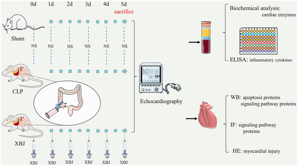 After surgery, all rats were kept alone and subcutaneously injected with lactated Ringer's solution (30 ml/kg) for fluid resuscitation. Imipenem/Cilastin (20 mg/kg s.c.) and flurbiprofen axetil injection (5 mg/kg i.v.) were used to alleviate postoperative pain. Rats in the XBJ group received XBJ (10 ml/kg s.c.) at 1 hour after CLP, whereas rats in the sham or CLP groups received the same amount of sterile saline treatment, with repeated dosing every 24 h for 5 days. The cardiac function was evaluated at 5 days after CLP. And then the serum and heart tissues were harvested and stored at -80° C for further investigation.