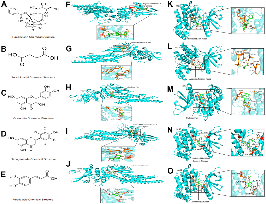 XBJ injection is known to have five key pharmacological components: Paeoniae Radix Rubra, Angelicae Sinensis Radix, Carthami Flos, Salviae Militiorrhizae Radix et Rhizuma and Chuanxiong Rhizuma. We selected the monomers corresponding to these five pharmacological components for molecular docking with JAK2/STAT3 signaling pathway through the Autodock Vina docking procedure. As our docking results suggested, the binding energies of complexes for paeoniflorin-JAK2, Succinic acid-JAK2, Quercetin-JAK2, Naringenin-JAK2, Ferulic acid-JAK2, paeoniflorin-STAT3, Succinic acid-STAT3, Quercetin-STAT3, Naringenin-STAT3, and Ferulic acid-STAT3 were -7.9 kcal/mol, -4.2 kcal/mol, -7.4 kcal/mol, -8.3 kcal/mol, -6.3 kcal/mol, -6.9 kcal/mol, -4.2 kcal/mol, -7.3 kcal/mol, -7.7 kcal/mol and -5.9 kcal/mol, respectively. We also presented the molecular structure of the monomers corresponding to the five components of XBJ in Figure 3A–3E. Furthermore, the 3D binding conformational structure for the paeoniflorin-JAK2 complex showed that a total of 3 hydrogen bonds were formed of paeoniflorin with ARG-938, ASN-981 and GLY-996 of JAK2 (Figure 3F). There are 5 hydrogen bonds that were formed of Succinic acid with ARG-980, ASN-981, ASP-994, GLY-996 and LEU-997 of JAK2 in the 3D crystal structure for the Succinic acid-JAK2 complex (Figure 3G). There are 5 hydrogen bonds that were formed of Quercetin with THR-998, TYR-1021, ARG-980, ARG-938 and LEU-997 of JAK2 in the 3D crystal structure for the Quercetin-JAK2 complex (Figure 3H). There are 4 hydrogen bonds that were formed of Naringenin with ARG-938, LEU-855, LEU-997 and THR-998 of JAK2 in the 3D crystal structure for the Naringenin-JAK2 complex (Figure 3I). There are 4 hydrogen bonds that were formed of Ferulic acid with ARG-938, LEU-997, THR-998 and ASN-981 of JAK2 in the 3D crystal structure for the Ferulic acid-JAK2 complex (Figure 3J). There are 3 hydrogen bonds that were formed of paeoniflorin with ASN-647, LYS-658 and GLN-644 of STAT3 in the 3D crystal structure for the paeoniflorin-STAT3 complex (Figure 3K). There are 5 hydrogen bonds that were formed of Succinic acid with LYS-370, ASP-369, HIS-437, LEU-438 and ASP-371 of STAT3 in the 3D crystal structure for the Succinic acid-STAT3 complex (Figure 3L). There are 4 hydrogen bonds that were formed of Quercetin with PRO-333, GLN-326, GLN-247 and ASN-257 of STAT3 in the 3D crystal structure for the Quercetin- STAT3 complex (Figure 3M). There are 3 hydrogen bonds that were formed of Naringenin with SER-540, TYR-539 and THR-526 of STAT3 in the 3D crystal structure for the Naringenin-STAT3 complex (Figure 3N). There are 4 hydrogen bonds that were formed of Ferulic acid with ASP-334, GLN-326, GLU-324 and GLN-247 of JAK2 in the 3D crystal structure for the Ferulic acid-JAK2 complex (Figure 3O). In this study, JAK2 and STAT3's protein-ligand binding sites were found in the inhibitor-binding domain. These results supported the interaction between XBJ and JAK2/STAT3 signaling pathway.