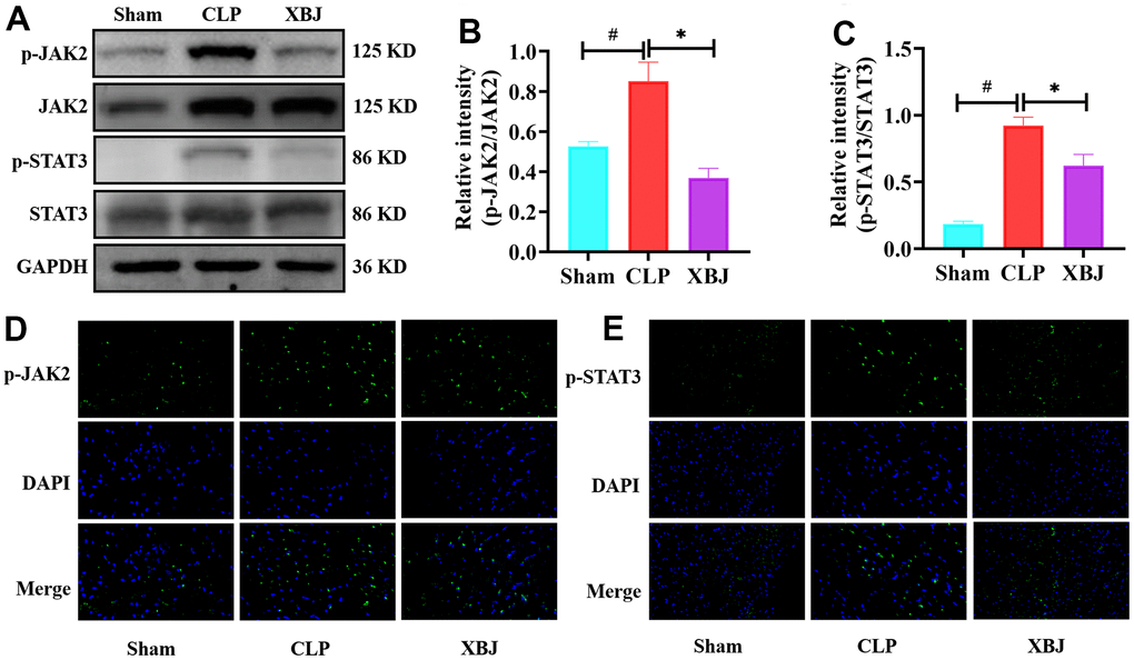 After verifying that XBJ protects against cardiac injury, and excessive inflammation in rat after CLP condition, we looked into how XBJ influences the activation of JAK2/STAT3 pathways. On the one hand, western blotting was performed to detect phosphorylation levels of proteins in the JAK2/STAT3 pathways. p-JAK2 (Figure 4A, 4B), and p-STAT3 (Figure 4A, 4C) expression levels in the CLP group were obviously higher than those in the Sham group, however the application of XBJ blocked the high expression (p<0.05). On the other hand, immunofluorescence was subjected to pinpoint where the JAK2/STAT3 pathway was phosphorylated in the heart tissue. p-JAK2 (Figure 4D) and p-STAT3 (Figure 4E) mainly accumulated on cardiomyocyte in the CLP group, whereas the pretreatment with XBJ lessened their levels (p<0.05). These results demonstrated that XBJ repressed the phosphorylation levels of JAK2/STAT3 pathways in CLP-treated rat.