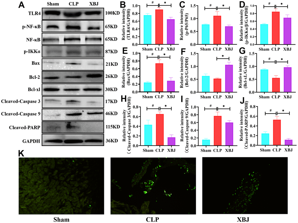We looked further into how XBJ influences the activation of TLR4/NF-κB/IKKα pathways. Western blotting was performed to detect phosphorylation levels of proteins in the TLR4/NF-κB/IKKα pathways. TLR4 (Figure 5A, 5B), p-NF-κB (Figure 5A, 5C) and p- IKKα (Figure 5A, 5D) expression levels in the CLP group were obviously higher than those in the Sham group, however the application of XBJ blocked the high expression (p<0.05). Activation of apoptosis plays an important role in myocardial injury in sepsis. The expression of proapoptotic proteins (Bax, Cleaved-Caspase 3, Cleaved-Caspase 9, and Cleaved-PARP) and antiapoptotic proteins (Bcl-2 and Bcl-xl) was tested using western blotting to evaluate the impact of XBJ on CLP-mediated cardiomyocyte apoptosis. In the CLP group, apoptosis-related proteins Bax (Figure 5A, 5E), Cleaved-Caspase 3 (Figure 5A, 5H), Cleaved-Caspase 9 (Figure 5A, 5I), and Cleaved-PARP (Figure 5A, 5J) had dramatically higher expression levels, but Bcl-2 (Figure 5A, 5F) and Bcl-xl (Figure 5A, 5G) had sharply lower expression levels (p<0.05). However, injection of XBJ reversed changes of these apoptosis-related proteins in the myocardium of CLP-treated rat (p<0.05). Additionally, we used TUNEL staining (Figure 5K) to observe that the CLP group's cardiomyocyte apoptosis was clearly apparent when compared to the myocardial structure of the Sham group. However, treatment with XBJ significantly improved CLP-induced cardiomyocyte apoptosis. These results indicated that XBJ suppressed the cardiomyocyte apoptosis brought on by CLP in rat.