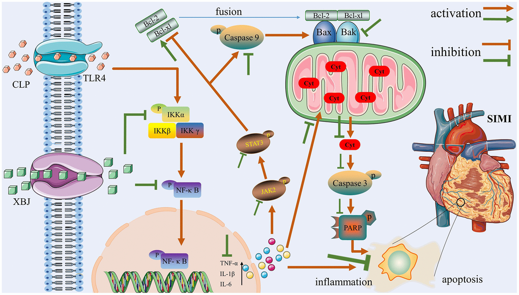 One of the main illnesses that represent a grave hazard to people's health all around the world is sepsis, a potentially lethal host reaction to infection that results in organ failure. Myocardial injury is one of the most common side effects and a key factor of fatalities in septic patients. It was reported that apoptosis and inflammatory storms have a role in the pathophysiological mechanisms of SIMI [24]. Compelling evidence from clinical or basic research has demonstrated that XBJ exerted protective effects against sepsis. So, we designed this experiment to explore the underlying mechanisms of XBJ protects against SIMI. CLP is known to be the gold standard for simulating sepsis models in in vivo experiments [25]. In our study, we induced sepsis in rats with CLP to mimic the clinical context of patients with sepsis. There is one highlight: The protective effect of XBJ on SIMI may play an anti-apoptotic and anti-inflammatory role by regulating TLR4/IKKα-mediated NF-κB and JAK2/STAT3 signaling pathways. Figure 6 illustrates these three components, which will serve as the central concepts of this article.