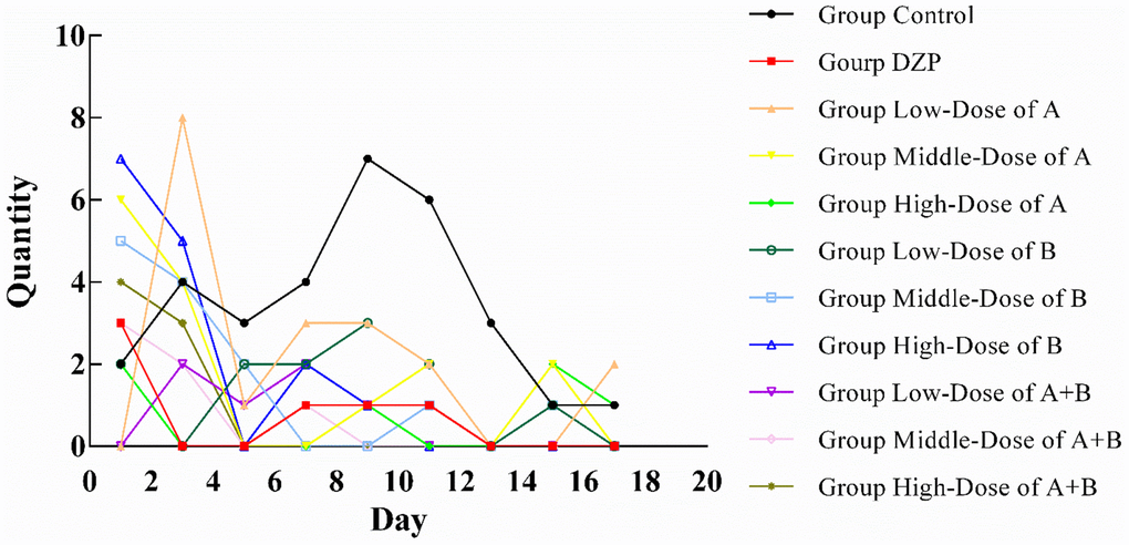 The sleep status of all animals in this study is shown in Figure 1. All animals had poor sleep status at the first sleep observation, which was caused by the mice’s need to adapt to the new environment (the location of the open-field test). This situation improved significantly with the third observation. Compared with the control group, the sleep status of each test group improved with the extension of feeding time. The animals in Group DZP were able to enter a sleep state within 1 h from the 11th observation day, similar to those in Group JuA. The sleep status of the high-dose JuA group was slightly better than that of the medium and low-dose groups, in which the mice could fall asleep within 1 h from the 5th day of observation. One of them fell asleep within one hour in the latter observation, which might be caused by an external influence. JuB had a slightly better sleep-assisting effect than JuA. The mice in the low-dose group fell asleep within 1 h on the 13th day, whereas they fell asleep on the 7th and 5th days in the medium-dose and high-dose groups. However, possibly due to external interference, one animal did not fall asleep within 1 h. After the simultaneous intake of JuA and JuB, the sleep state of the test animals was significantly better than that of the other groups. At the low dose of JuA+B, all test animals fell asleep within 1 h on the 11th day, and in the medium and high dose groups, this occurred on the 9th day of the experiment. In addition, when JuA and JuB were ingested simultaneously after the animals fell asleep, the sleep condition was very stable in the follow-up observation, and there was no similar situation in the other groups.