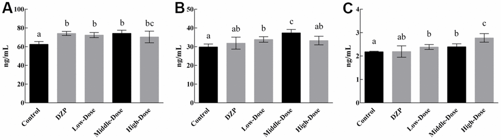 The serum levels of the neurotransmitters are shown in Figure 2. Generally, the simultaneous intake of JuA+B exerted an impact on the expression levels of the three types of neurotransmitters. The level of 5-HT showed a slight increase with drug intake (Figure 2A), which was significantly higher than the control group (p<0.05), similar to the DZP group, and there was no dose dependence. The level of DA in the medium-dose group (Figure 2B) was significantly higher than that in the control and other groups (p<0.05), but lower than that in the high-dose group. The simultaneous intake of two types of saponins had a dose-dependent effect on NE levels (Figure 2C), and the NE level in the high-dose group was significantly higher than that in the control and other experimental groups (p<0.05). Since the tested animals did not show any differences during feeding other than drug intake, it is reasonable to conclude that the differential expression of neurotransmitters was caused by the intake of JuA + B. Although numerous studies have shown a strong relationship between the expression of these neurotransmitters and sleep status, it remains to be determined at the protein level what changes are produced in brain tissue.