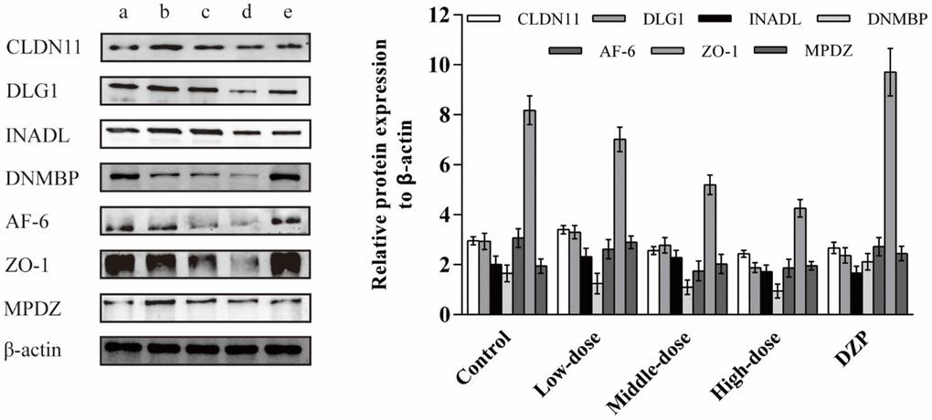 To further identify the effect of JuA+B on protein expression in the hypothalamus, the expression levels of the major DE proteins involved in tight junction processing, including CLDN11, DLG1, INADL, DNMBP, AF-6, ZO-1, and MPDZ, were investigated. The expression of all DE proteins decreased with increasing drug dosage (Figure 5), consistent with the proteomics results (Table 1). In addition, compared with the control and DZP groups, the expression of DE proteins in the different dose groups was significantly different; meanwhile, the expression of DE proteins in the control and DZP groups was similar. This showed that the mechanism of Jujuboside and DZP in improving sleep is completely different.