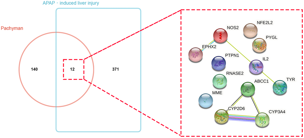 The putative target genes in pachyman were collected from the respective databases, and 152 genes of pachyman were identified. Meanwhile, 383 APAP-induced liver injury genes were obtained. By assaying the intersection of the drug and disease targets, a total of 12 common or overlapping genes were acquired from the Venn mapping analysis: CYP3A4, ABCC1, NOS2, NFE2L2, TYR, EPHX2, RNASE2, PYGL, IL2, MME, PTPN1, and CYP2D6, as shown in Figure 1.