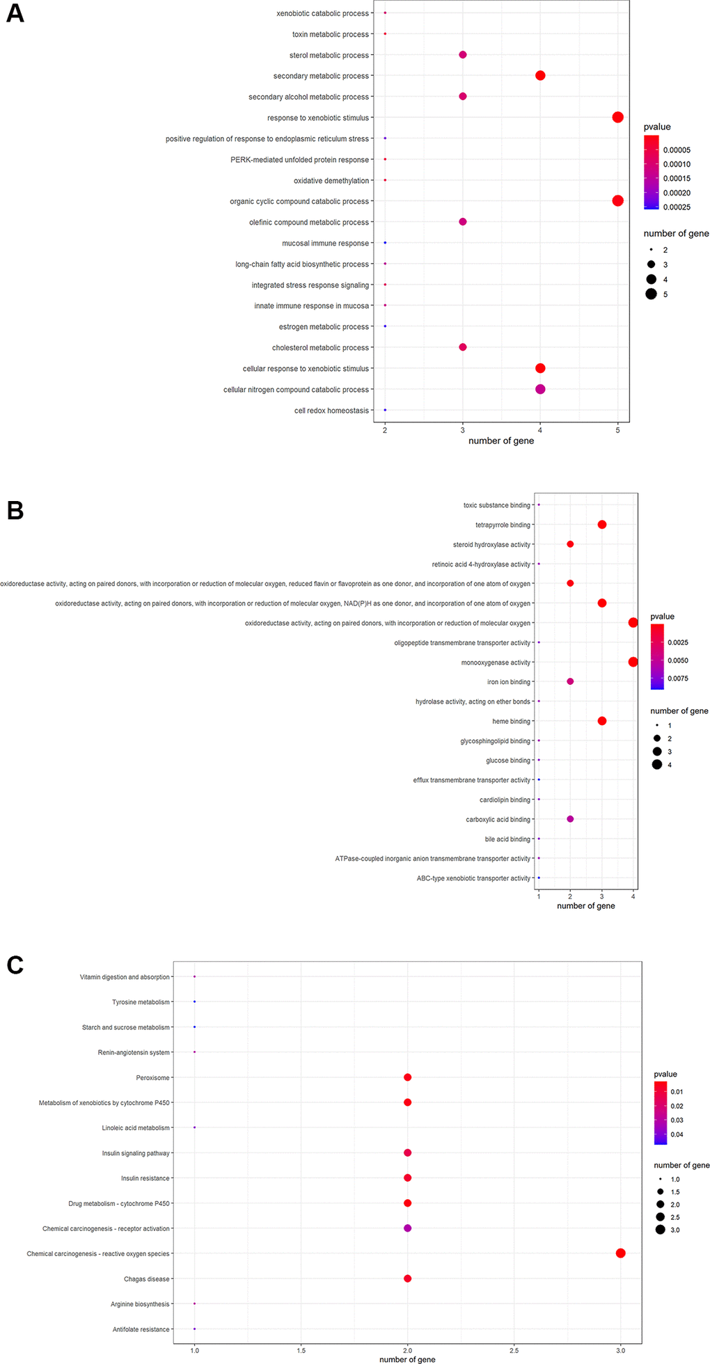 R-language software was used to conduct GO and KEGG assays to disclose the beneficial functions and mechanisms of pachyman against APAP-induced liver injury. All top biological processes (BPs), cellular components (CCs), and molecular functions (MFs) in GO annotations were illustrated in Figure 2A–2C, respectively. Other main signaling pathways in KEGG enrichment were presented in Figure 3. As per KEGG findings (p-value < 0.05), the pachyman-exerted anti-liver injury action against APAP might mainly involve chemical carcinogenesis-reactive oxygen species, drug metabolism-cytochrome P450, metabolism of xenobiotics by cytochrome P450, peroxisome, insulin resistance, insulin signaling pathway, arginine biosynthesis, renin-angiotensin system, chemical carcinogenesis-receptor activation, vitamin digestion and absorption, linoleic acid metabolism, antifolate resistance, tyrosine metabolism, and starch and sucrose metabolism. In addition, BPs were largely related to secondary metabolic process, cellular response to xenobiotic stimulus, organic cyclic compound catabolic process, toxin metabolic process, PERK-mediated protein response, oxidative demethylation, cholesterol metabolic process, integrated stress response signaling, and secondary alcohol metabolic process. CCs were mostly involved in peroxisomal matrix, microbody lumen, peroxisome, microbody. MFs were chiefly implicated in monooxygenase activity, oxidoreductase activity, acting on paired donors, with incorporation or reduction of molecular oxygen, NAD(P)H as one donor, and incorporation of one atom of oxygen, heme binding, tetrapyrrole binding, steroid hydroxylase activity, reduced flavin or flavoprotein as one donor, and incorporation of one atom of oxygen, iron ion binding, carboxylic acid binding, and retinoic acid 4-hydroxylase activity.