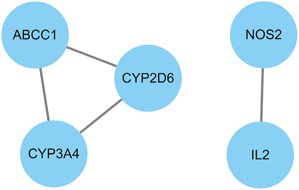 We used Cytoscape software to calculate the topological parameters of pachyman against APAP-induced liver injury targets and function-related protein interaction network. The median degree of freedom of these targets was 2, and the maximum degree of freedom was 2. Based on parametrical analysis, all 5 core targets were finally obtained, including ABCC1, CYP3A4, CYP2D6, NOS2, and IL2 (Figure 4).