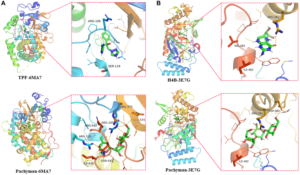 The interaction and binding models of core target proteins and pachyman can be characterized at the molecular and spatial levels. We discovered the findings including CYP3A4 (TPF-6MAT: ARG-106 (2.7 Å), SER-119 (2.1 Å), free docking score: −6.5 Kcal/mol; Pachyman-6MAT: GLU-374 (2.8 Å), ARG-375 (3.2 Å), ARG-105 (3.1 Å), ARG-440 (2.8 Å), ASN-441 (2.6 Å), ARG -130 (2.8 Å), ILE-443 (3.0 Å), free docking score: −7.4 Kcal/mol) (Figure 5A) and NOS2 (H4B-3E7G: RG-381 (2.8 Å), VAL-465 (2.4 Å), ILE-462 (2.2 Å), free docking score: −5.6 Kcal/mol; Pachyman-3E7G: ARG-381 (2.8 Å), ASP-382 (2.1 Å), ILE-462 (2.3 Å), free docking score: −6.5 Kcal/mol) (Figure 5B) resulted in potent binding sites in the target proteins. These in-silico data suggested that pachyman could bind tightly to CYP3A4 and NOS2.