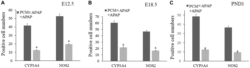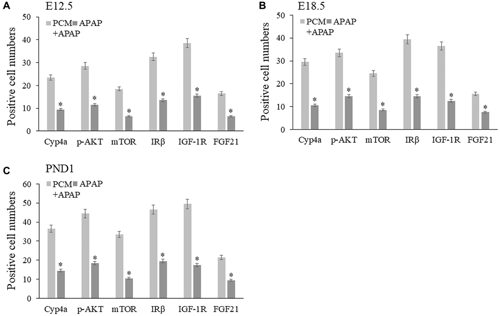 In brief, the liver specimens from E12.5, E18.5 and PND1 were isolated for preparing paraffin block before performing microtome section. Subsequently, 5 μm paraffin-embedded sections were subjected to deparaffinization and gradient dehydration. After being blocked with fresh bovine serum albumin buffer (5%, v/v), the dewaxed sections were hatched with primary antibodies against Cyp4a, p-AKT, mTOR, IRβ, IGF-1R, FGF21, CYP3A4, and NOS2 (1:150–200 dilutions; Bioss, Beijing, China) at 4°C overnight. After being washed with neutral phosphate buffered saline buffer, the sections were re-hatched with secondary antibody-coupled fluorescent dye (Beyotime Biotechnology, China) under light-free conditions for approximately 1 h at indoor temperature. Subsequently, 4′,6-diamidino-2-phenylindole (DAPI, Beyotime, China) dye was used for nuclear staining, in which the positive cells were identified under different magnification view and counted for statistic determination, as previously reported [30].