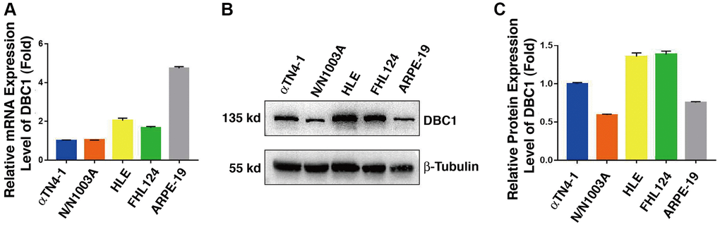 In order to analyze DBC1 function in the ocular lens, we first analyzed the expression patterns of DBC1 in lens cell lines derived from different vertebrates and also retina pigment epithelial cells. qRT-PCR and western blot analysis were used to examine the mRNA and protein levels of DBC1 in 4 lens cell lines: αTN4-1 (mouse lens epithelial cells), N/N1003A (rabbit lens epithelial cells), HLE (human lens epithelial cells containing a SV40 large T antigen) and FHL124 (human embryonic lens epithelial cells), and a human retinal pigment epithelial cell line: ARPE-19. As shown in Figure 1A, the mRNA level of DBC1 was highest in ARPE-19, followed by HLE and FHL124, and lower in αTN4-1 and N/N1003A. In contrast, the protein expression of DBC1 in human (HLE and FHL124) and mouse (αTN4-1) lens epithelial cells displayed the highest levels (Figure 1B, 1C), suggesting that DBC1 may play a crucial role in these cells.