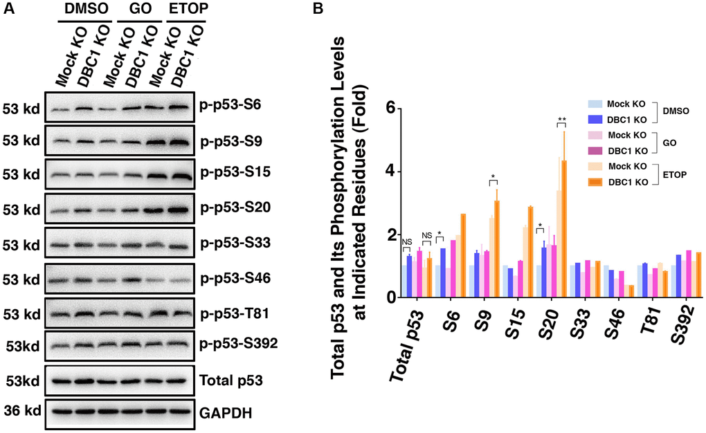 Since phosphorylation of p53 has been implicated in regulating its stability and apoptotic activity [74, 75], we examined whether DBC1 affects phosphorylation status of p53. We used etoposide (ETOP) as a positive control, which has been shown to induce phosphorylation of p53 [76]. As shown in the Figure 10A and 10B, through immunoblot analysis, we detected that knockout of DBC1 significantly promoted the phosphorylation of p53 at S6, S9 and S20. This result demonstrated that DBC1 is capable of modulating the phosphorylation status of p53 and thus regulating its functional status.
