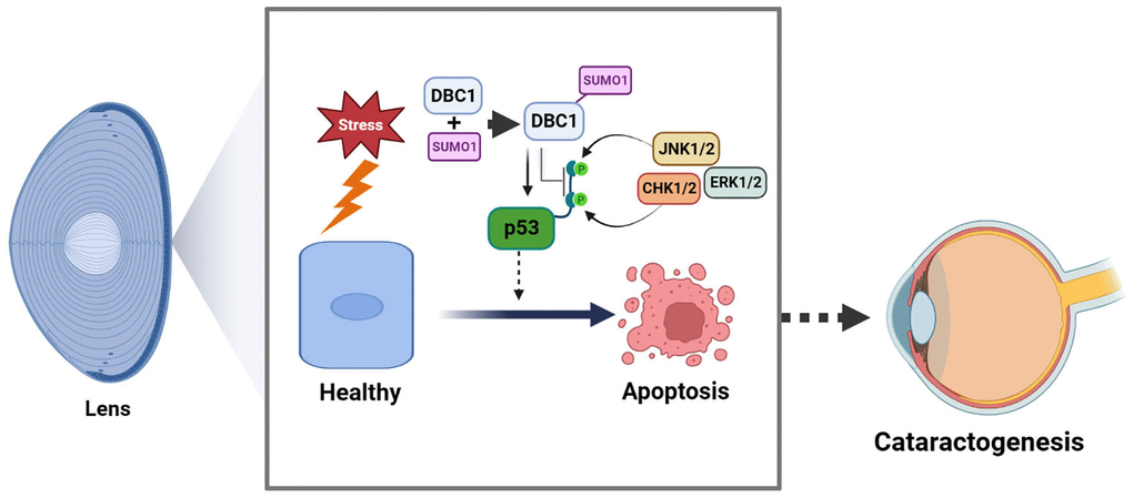 In the present study, we demonstrated for the first time that DBC1 is highly expressed in human and mouse lens epithelial cells. DBC1 is localized in the nucleus where it becomes SUMOylated through SUMO1 conjugation. Functionally, it can promote stress-induced apoptosis, and thus participating the control of cataractogenesis [7–9]. Mechanistically, DBC1 can interact with p53 to modulate the phosphorylation status at multiple sites, and its SUMOylation enhances the interaction with p53. Together, our results identify that DBC1 is an important regulator mediating stress-induced apoptosis in lens. Through promotion of stress-induced apoptosis, DBC1 is implicated in control of formation of cataract, a leading ocular disease that causes global blindness [72].