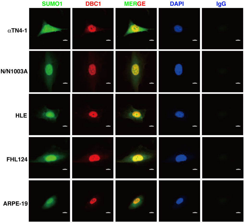 Next, we used immunofluorescence to determine the subcellular localization of DBC1 in different cell lines described above. As shown in Figure 2, DBC1 is clearly localized in the nuclei, which is consistent with previous studies in non-ocular cell lines [73]. Since our previous studies have revealed that specificity protein 1 (Sp1), a major transcription factor that controls expression of lens-specific genes such as β-crystallins, was positively regulated by SUMO1 but negatively regulated by SUMO2/3 [68], we speculated that DBC1 may be medullated by SUMO1 conjugation in the lens epithelial cells. As shown in Figure 2, indeed, we detected a distinct nuclear colocalization between DBC1 and SUMO1 in 4 lens epithelial cell lines as well as in retina RPE cells, suggesting that DBC1 is SUMOylated by SUMO1 conjugation in these ocular cell lines.