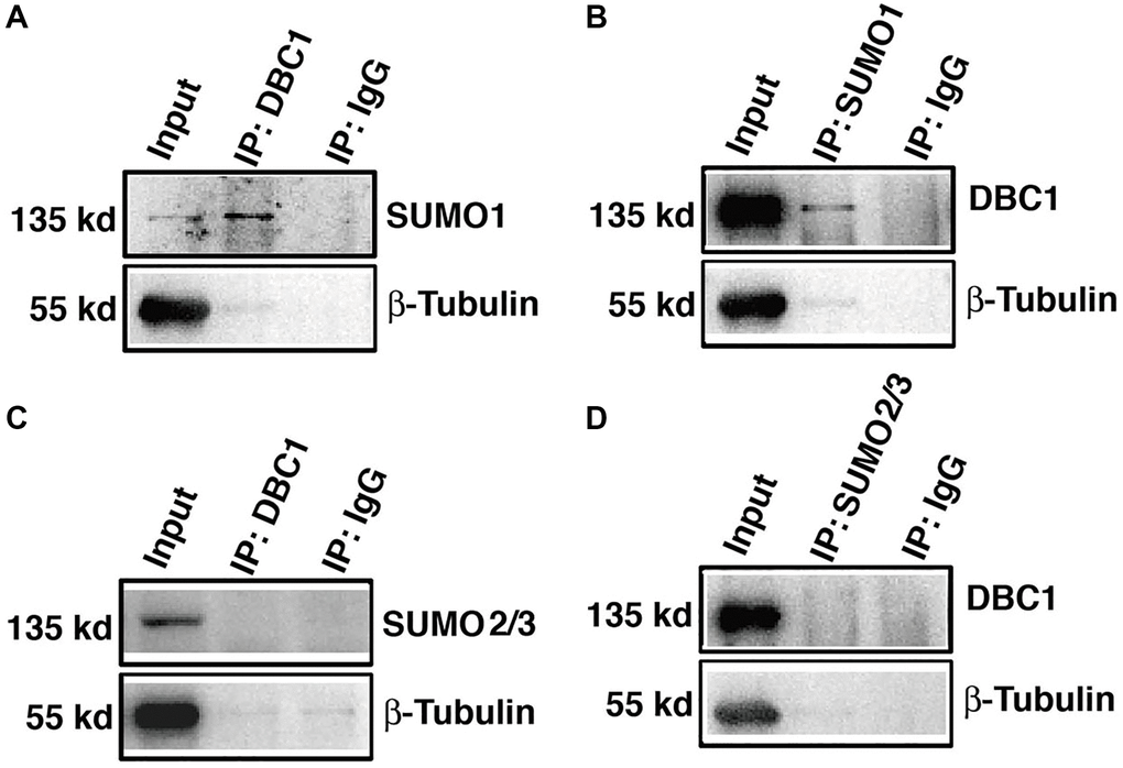 To confirm that DBC1 is indeed SUMOylated by SUMO1 conjugation, we dissected lens epithelium tissue of C57BL/6J mice and conducted co-immunoprecipitation (Co-IP) assays with anti-DBC1 and anti-SUMO1 or SUMO2/3 antibodies, respectively. As shown in Figure 3A, 3B, we can detect an obvious interaction between DBC1 and SUMO1 of mouse lens epithelium and vice versa. However, the Co-IP analysis between DBC1 and SUMO2/3 revealed absence of the interaction between them (Figure 3C, 3D). Thus, DBC1 is SUMOylated through conjugation with SUMO1 but not SUMO2/3 in mouse lens epithelial cells.