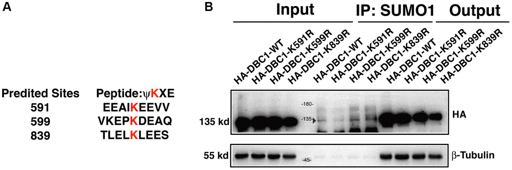 To identify the SUMOylation site in DBC1 in lens epithelial cells, we used GPS-SUMO software to predict the possible SUMOylation site in DBC1 and identified 3 putative sites: K591, K599 and K839 (Figure 4A). To determine the major residue responsible for SUMOylation of DBC1, we constructed wild-type DBC1 expression plasmid with HA tag, and also generated K to R mutations at the above 3 putative SUMO sites. These plasmids were transfected into FHL124 cells and then harvested for Co-IP analysis. As shown in Figure 4B, SUMO1-conjugation signal at the DBC1 K591R mutant transfected cells were much weaker than that in wild type DBC1-transfected cells, indicating K591R mutation almost abrogated DBC1 SUMOylation. The opposite results were observed in K599R and K839R-transfected cells. Together, these results demonstrated that in lens epithelial cells (LECs), DBC1 is SUMOylated by SUMO1 conjugation at K591 residue.