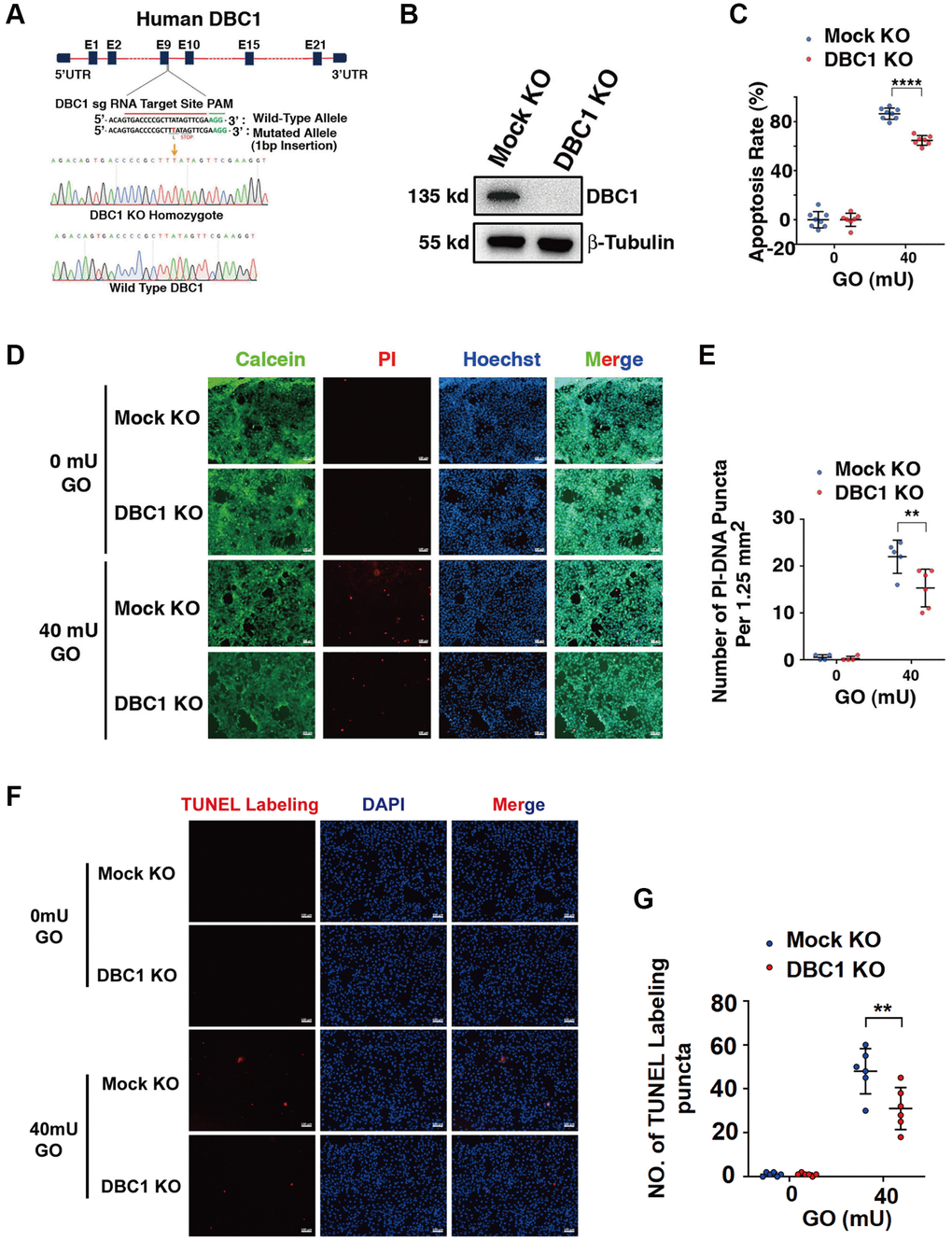To test the function of DBC1 in LECs, we used CRISPR/Cas9 technology to knockout expression of DBC1 in FHL124 cell (Figure 5A). The insertion of a single nucleotide in exon 9 was confirmed with DNA sequencing (Figure 5A) and the absence of DBC1 protein expression was verified by western blot analysis (Figure 5B). Next, we tested if DBC1 deletion could affect the sensitivity of human LECs to oxidative stress-induced apoptosis, we treated the control (mock KO) and DBC1 knockout (DBC1 KO) cells with 40 mU glucose oxidase (GO) for 5 hours, and the cell viability was measured by ATP loss. As shown in Figure 5C, cells with DBC1 deletion showed much stronger resistance to oxidative stress-induced apoptosis than the mock KO cells. Identically, the same treatment was used for live/dead viability/cytotoxicity assay, which revealed that cells with knockout of DBC1 displayed enhanced survival under oxidative stress (Figure 5D, 5E). The apoptotic nature was further confirmed by TUNEL labeling (Figure 5F, 5G). Together, these results demonstrated that silence of DBC1 attenuates oxidative stress-induced apoptosis of human LECs.