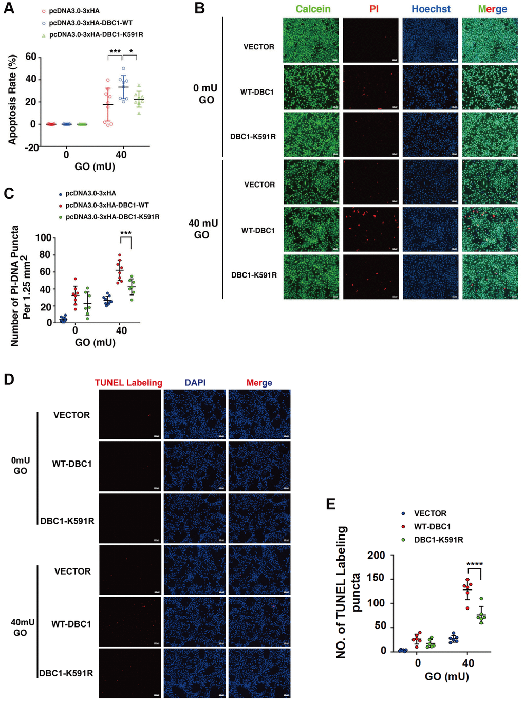 To test if DBC1 SUMOylation has an influence on stress response. We transfected the DBC1(−/−) FHL124 cells with HA-vector, HA-DBC1-WT and HA-DBC1-K591R, respectively. 24 hours after transfection, the cells were treated with 40 mU GO and the apoptosis rate was subsequently measured by several methods: ATP loss analysis, live/dead viability/cytotoxicity assay, and TUNEL labeling. As shown in Figure 6A, ATP loss analysis revealed that HA-DBC1-K591R-transfected cells had stronger resistance against GO-induced apoptosis in LECs than HA-DBC1-WT-transfected cells. Live/dead viability/cytotoxicity assay further confirmed that de-SUMOylated DBC1 showed greater resistance to oxidative stress-induced apoptosis than wild type DBC1 (Figure 6B, 6C). HA-DBC1-K591R-transfected cells displayed less apoptotic cells than wild type DBC1-transfected FHL124 cells did (Figure 6D, 6E). Together, these results confirmed that SUMO1-mediated DBC1 SUMOylation sensitizes lens epithelial cells to oxidative stress-induced apoptosis.
