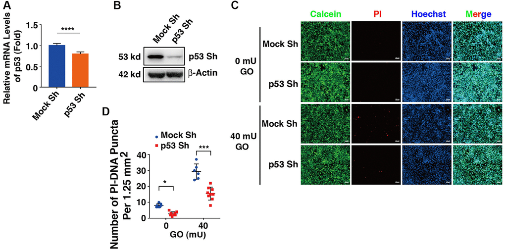 To test if the proapoptotic function of DBC1 was indeed through p53-dependent pathway, we next established p53 knockdown cells using shRNAs either for nonspecific control (Mock Sh) or targeting p53 knockdown (p53 Sh) through lentivirus infection technology. The p53 knockdown at mRNA and protein expression levels was verified by qRT-PCR and western blot analysis (Figure 8A, 8B). Next, HA-DBC1 expression plasmid was transfected into Mock Sh and p53 Sh cells. After 24 hours, these cells were treated with 40 mU GO for 5 hours. As shown in Figure 8C, 8D, live/dead viability/cytotoxicity assay revealed that lack of p53 led to attenuated levels of apoptotic cells in DBC1-transfected cells induced by GO. Taken together, these results demonstrated that p53 silencing abrogates DBC1 promotion of oxidative stress-induced apoptosis.