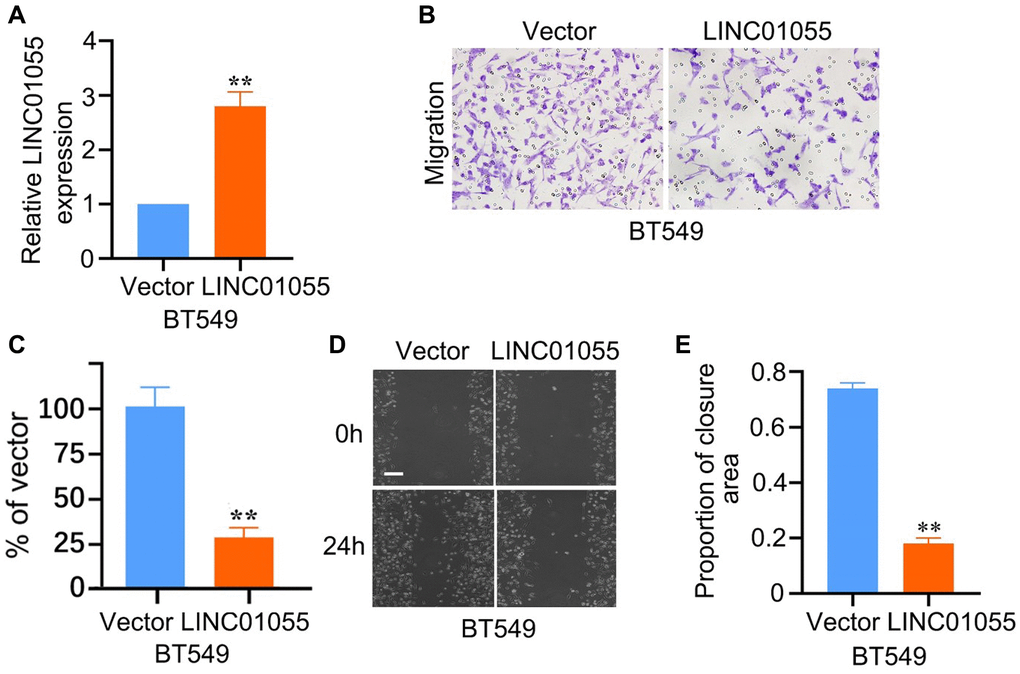 To further verify whether LINC01055 affects the progression of BRCA, we transfected human BRCA cell line BT-549 with an adenovirus vector overexpressing LINC01055. qRT-PCR results showed that LINC01055 was significantly overexpressed compared to the negative control (Figure 10A). Scratch assay and Transwell analysis were subsequently performed to evaluate the role of LINC01055 in BRCA migration and invasion. Transwell results showed that overexpression of LINC01055 significantly reduced the number of BT-549 cells passing through the lower chamber in comparison to the control group (Figure 10B, 10C). Similarly, scratches in the vector control group continued to heal over time, while overexpression of LINC01055 inhibited the ability of cells to migrate to the scratched area (Figure 10D, 10E). These results suggest that overexpression of LINC01055 can inhibit the migration and invasion of BRCA cells.