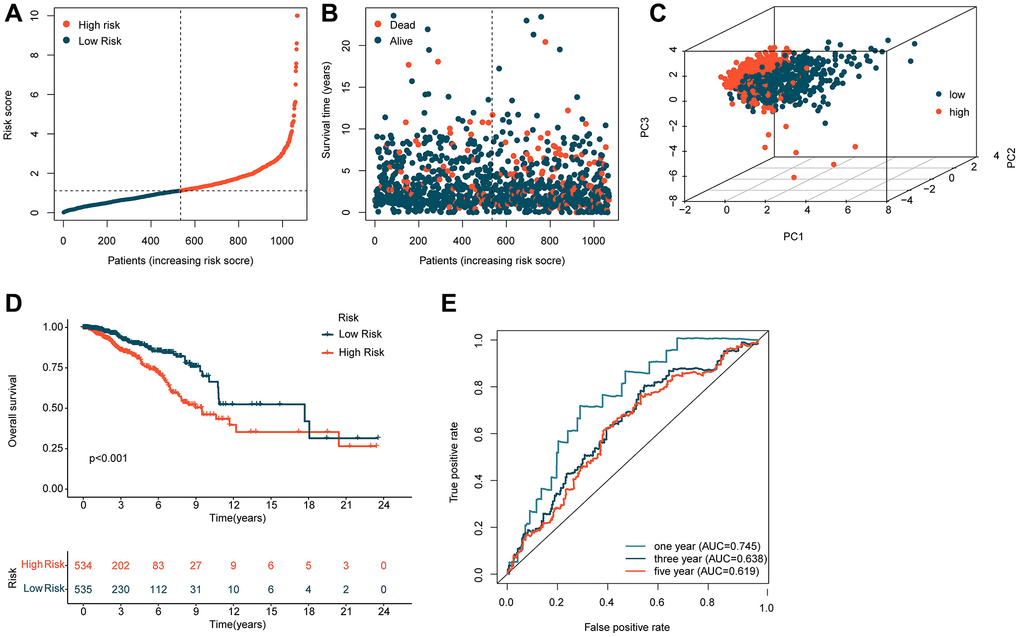 Based on the coefficients obtained from the multivariate Cox analysis for five independent prognostic factors, we calculated the risk score for each BRCA sample. To explore the potential association between the risk score and BRCA prognosis, we divided the BRCA samples into two risk subgroups based on the median risk score and constructed a novel risk model, as shown in Figure 2A, 2B. The unsupervised PCA model based on the five independent prognostic factors clearly distinguished the risk subgroups of BRCA (Figure 2C). Clinical survival outcomes indicated that the low-risk subgroup had better survival prognosis than the high-risk subgroup of BRCA (Figure 2D). Furthermore, time-dependent ROC curve analysis showed that the AUC values for 1-, 3-, and 5-year survival were 0.745, 0.638, and 0.619, respectively (Figure 2E). These findings suggest that the risk model constructed based on the five independent ICDRLs prognostic factors may be associated with BRCA prognosis and can provide insights into different clinical survival outcomes.