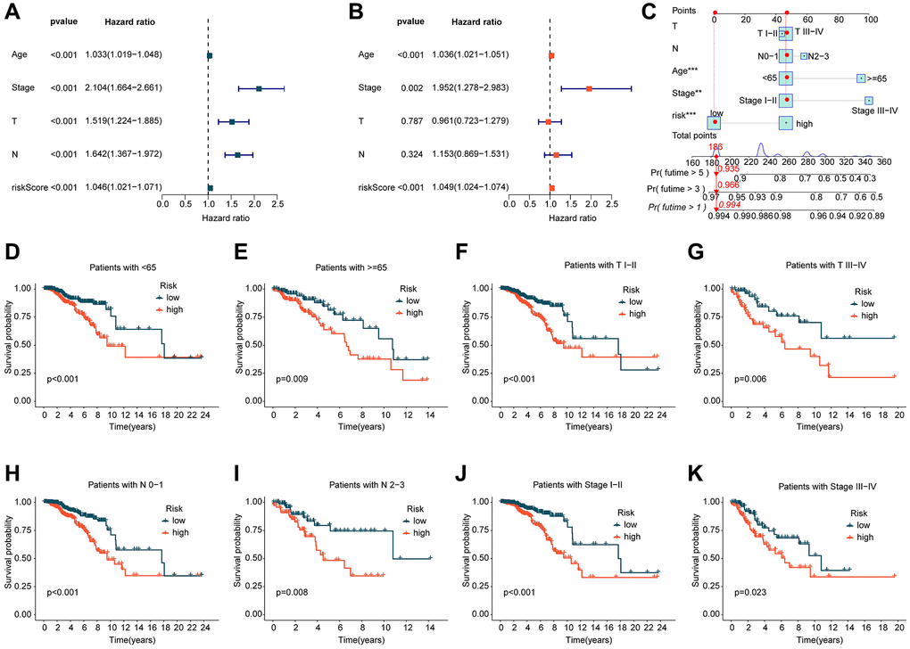 In view of the potential role of ICDRLs prognostic features in predicting the clinical survival outcome of BRCA, we integrated the clinical information of each BRCA sample and explored the independent prognostic value of each variable. We conducted both univariate and multivariate Cox analyses and calculated the hazard ratio (HR), p-value, and risk score for different clinical variables. Univariate Cox analysis revealed that age, stage, T, N, and risk score were closely associated with adverse prognostic outcomes in BRCA (HR > 1, p < 0.001). Multivariate Cox analysis suggested that the prognostic model based on five independent ICDRLs prognostic factors was an independent prognostic factor for BRCA (Figure 3A, 3B). Additionally, we developed a nomogram based on different clinical variables and ICDRLs prognostic features to accurately analyze the survival probability of BRCA at 1, 3, and 5 years (Figure 3C). In addition to evaluating the independent prognostic value of ICDRLs prognostic features, we also explored their prognostic value in different clinical-pathological features. Based on the median value of ICDRLs risk scores, BRCA samples with different clinical-pathological features were classified into high- and low-risk subgroups (Figure 3D–3K). Clinical survival outcome analysis revealed that in different clinical-pathological subgroups, the clinical prognosis of low-risk group BRCA samples was better than that of high-risk group samples. We therefore conclude that the prognostic model based on five ICDRLs features is an independent prognostic factor for BRCA and can accurately evaluate the clinical prognosis of BRCA in different clinical-pathological features.
