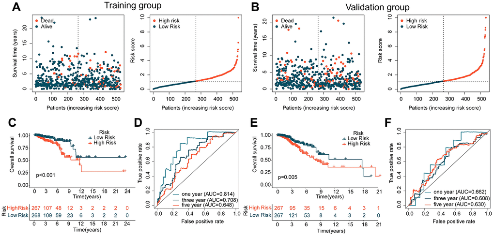 In the subsequent study, we further explored the independence and accuracy of ICDRLs prognostic features. Using the R script “caret” and a 1:1 random split, we divided BRCA samples from TCGA into training and validation cohorts. Based on the coefficients calculated by the multivariate Cox model and the expression of the five ICDRLs, we computed the risk score for each BRCA sample in the training and validation cohorts and classified them into high- and low-risk subgroups according to the median risk score (Figure 4A, 4B). In the training cohort, we found that the low-risk subgroup had a better clinical prognosis for BRCA (Figure 4C). Time-dependent ROC curves indicated AUC values of 0.814, 0.708, and 0.648 for 1-, 3-, and 5-year survival, respectively (Figure 4D). In the validation cohort, we observed consistent results with the training cohort, with the low-risk subgroup showing better clinical outcomes compared to the high-risk subgroup (Figure 4E). The time-dependent ROC curves showed AUC values of 0.662, 0.608, and 0.630 for 1-, 3-, and 5-year survival, respectively (Figure 4F). Based on the results of these two independent cohorts, we conclude that the prognostic features based on the five ICDRLs can accurately evaluate the prognosis of BRCA.