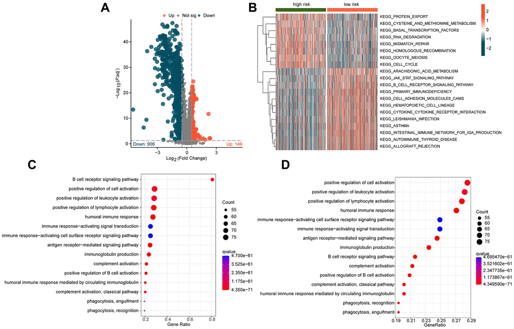 To explore the potential regulatory mechanisms underlying the differential clinical survival outcomes between different ICDRLs risk subgroups, we analyzed some potential signaling pathways and molecular functional mechanisms between the subgroups. Based on the limma script, we investigated the differentially expressed genes (DEGs) between the two risk subgroups. As shown in Figure 5A, we obtained 149 significantly upregulated DEGs and 906 significantly downregulated DEGs according to the differential analysis. The GSVA heatmap revealed that some immune-related signaling pathways, such as B cell receptor signaling pathway and cytokine-cytokine receptor interaction were significantly upregulated in the low-risk subgroup, while some cancer-related signaling pathways, such as cell cycle, mismatch repair and RNA degradation were significantly upregulated in the high-risk subgroup (Figure 5B). Furthermore, we conducted GO and KEGG enrichment analyses based on these DEGs (Figure 5C, 5D). The GO results indicated significant enrichment of DEGs in immune functional signaling pathways such as B cell receptor signaling pathway, positive regulation of cell activation, and positive regulation of leukocyte activation, while the KEGG enrichment results suggested significant correlation between DEGs and a series of immune-related signaling pathways, involving positive regulation of lymphocyte activation, positive regulation of leukocyte activation, and positive regulation of cell activation. Based on these results, we hypothesize that the differentially expressed genes based on ICDRLs risk subgroups are related to immune functional signaling pathways, and the changes in immune signaling pathways may be the potential mechanism causing different clinical survival outcomes between risk subgroups.