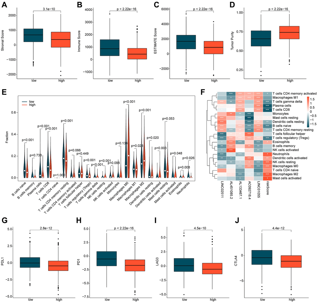 Based on the potential mechanisms of the ICDRLs risk subgroups, we speculate that immune-related changes may be the key factors that contribute to the differential outcomes observed in the ICDRLs risk subgroups. In light of this, we further explored the immune infiltration characteristics between different risk subgroups. Firstly, we employed the ESTIMATE algorithm to evaluate the immune status between two risk subgroups. The results indicate that the stromal, immune, and ESTIMATE scores were significantly lower in the high-risk group compared to the low-risk group, while the tumor purity was higher, suggesting a significant difference in immune status between the two risk subgroups (Figure 6A–6D). Using the CIBERSORT algorithm, we further assessed the immune infiltration characteristics of BRCA in the ICDRLs risk subgroups (Figure 6E). The proportion of 22 immune cells infiltrating the tumors suggests that the proportions of B cells naive, plasma cells, T cells CD8+, T cells CD4+ memory resting, T cells regulatory (Tregs), T cells gamma delta, macrophages M1, dendritic cells resting, mast cells activated, and neutrophils were higher in the low-risk group than in the high-risk group, while the proportions of NK cells resting, macrophages M0, macrophages M2, dendritic cells activated, and eosinophils were significantly lower in the high-risk group. Correlation analysis suggests that the ICDRLs risk score was significantly positively correlated with neutrophils, dendritic cells activated, NK cells resting, macrophages M0, eosinophils, mast cells activated, and mast cells resting, and significantly negatively correlated with T cells CD4 memory activated, T cells gamma delta, plasma cells, T cells CD8, mast cells resting, dendritic cells resting, B cells naive, and T cells CD4 memory resting. Meanwhile, we also observed a significant correlation between five prognostic factors and immune cell infiltration (Figure 6F). Immune checkpoint results indicate that the expression levels of PD-L1, PD-1, LAG3, and CTLA4 were significantly higher in the low-risk subgroup than in the high-risk subgroup (Figure 6G–6J). In summary, these results suggest significant differences in immune infiltration between different risk subgroups and may be related to the response to immune therapy.