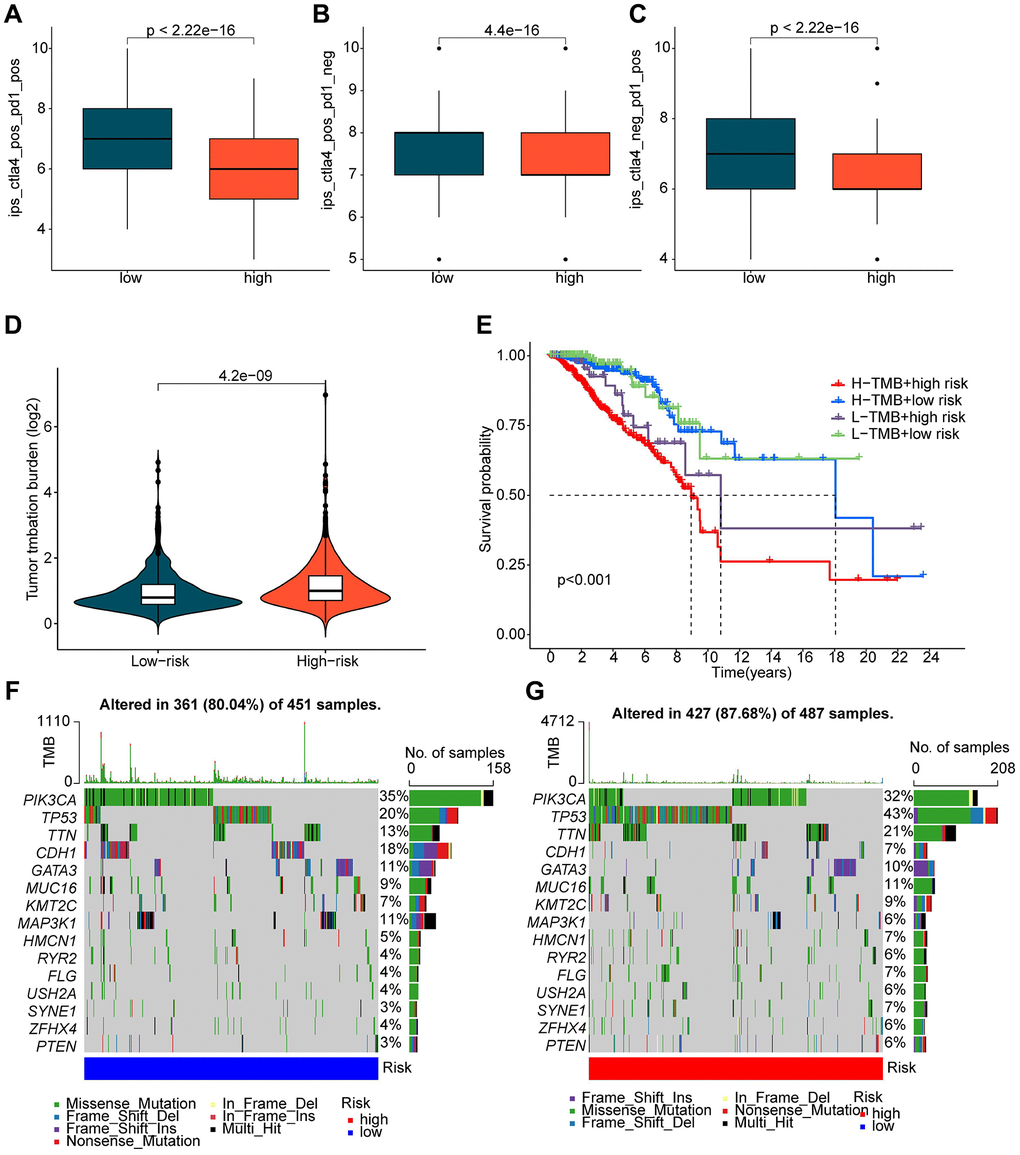 The application of immunotherapy strategies in BRCA treatment has shown remarkable potential. We conducted further evaluation of the immune therapy response of BRCA to PD-1 and CTLA4 in different ICDRLs risk subgroups. Utilizing the TCIA database, we predicted the immune therapy response of BRCA samples in both low and high-risk subgroups. The results demonstrated that BRCA samples in the low-risk group exhibited a significantly higher response to PD-1 and CTLA-4 therapy compared to the high-risk group (Figure 7A–7C). TMB analysis indicated that BRCA samples in the high-risk subgroup displayed a higher TMB score. Moreover, the clinical prognostic outcome of BRCA in the low-risk group was significantly better than that of the high-risk group in different mutational congruence subgroups (Figure 7D, 7E). The somatic mutation landscape results revealed that among 451 samples in the low-risk subgroup, 361 had somatic mutations, whereas among 487 samples in the high-risk subgroup, 427 had somatic mutations. In comparison to the mutation characteristics of the high-risk subgroup, we observed significantly lower mutation frequencies of TP53 and TTN in the low-risk subgroup. Notably, the mutation frequencies of PIK3CA, CDH1, and MAP3K1 were significantly lower in the high-risk subgroup than in the low-risk subgroup (Figure 7F, 7G). Based on these findings, we postulate that the ICDRLs prognostic characteristics based on five prognostic factors can reflect the immune therapy response of different risk subgroups and are associated with mutation feature.