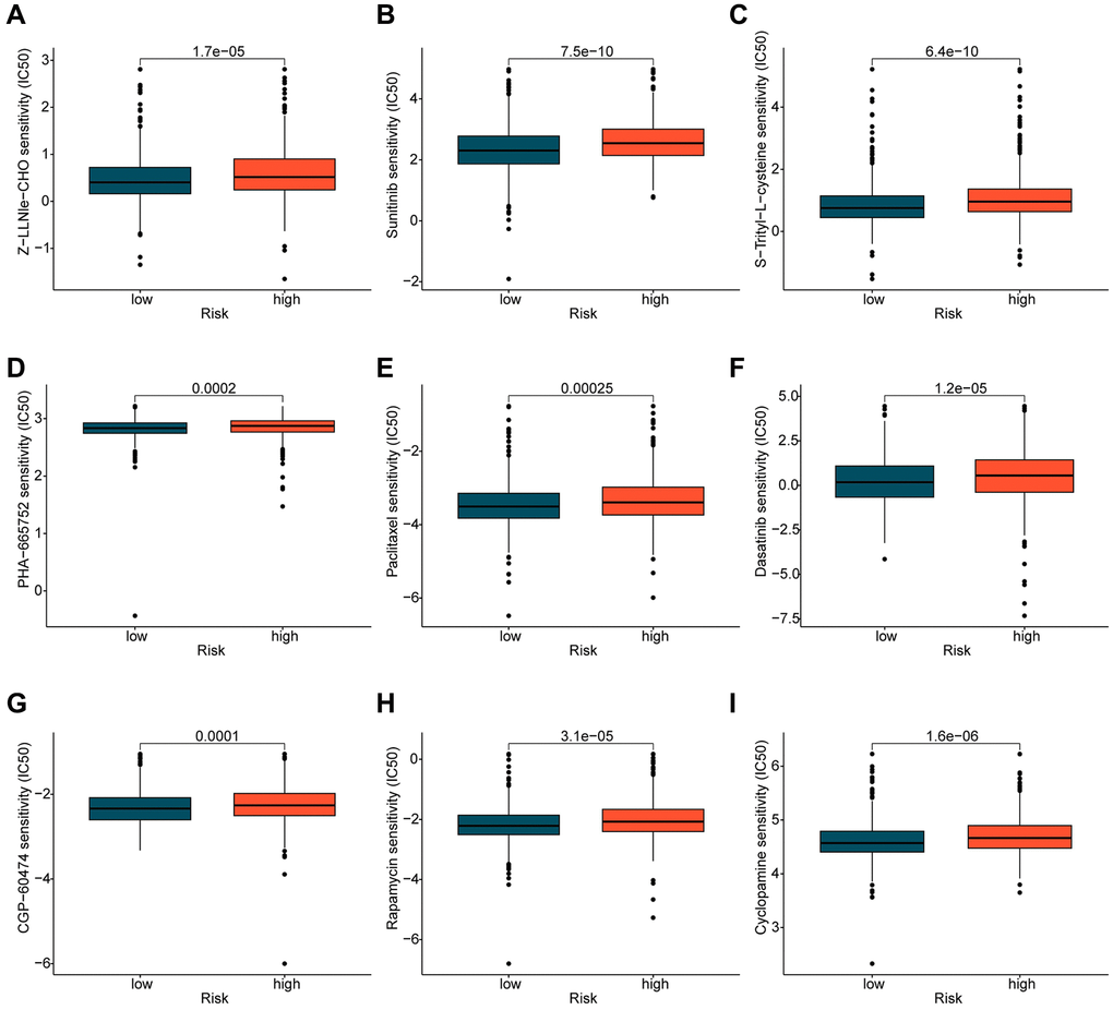 In addition to immunotherapy, chemotherapeutic treatment represents a crucial therapeutic approach for patients diagnosed with BRCA. In further investigations, we expanded our research by predicting the potential benefit of certain chemotherapy drugs for BRCA treatment, using the GDSC database. As illustrated in Figure 8, we identified significantly higher IC50 values of Z-LLNle-CHO, Sunitinib, S-Trityl-L-cysteine, PHA-665752, Paclitaxel, Dasatinib, CGP-60474, Cyclopamine, and Rapamycin in the high-risk group as opposed to the low-risk group. This finding implies that individuals diagnosed with BRCA and classified in the high-risk group may display a greater degree of sensitivity towards these chemotherapy drugs.