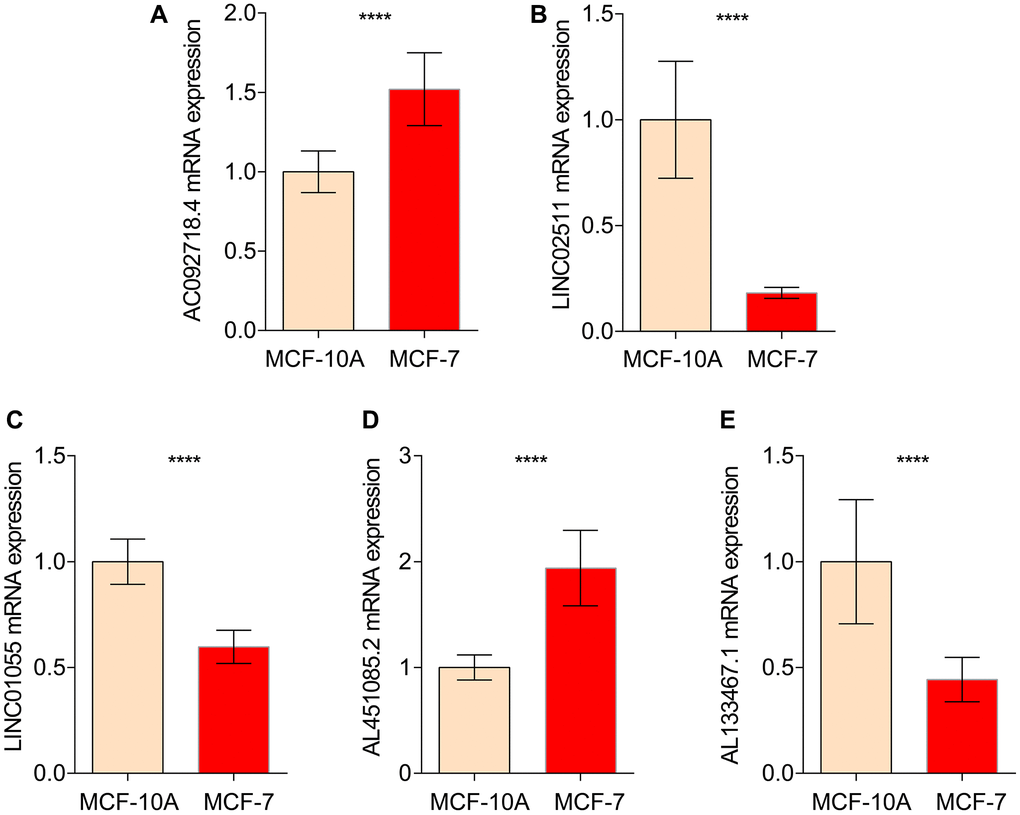 In order to further verify the abnormal expressions of ICDRLs in BRCA, human normal mammary epithelial cell line MCF-10A and BRCA cell line MCF-7 were utilized. MCF-7 had higher mRNA expressions of AC092718.4, AL451085.2, while lower LINC02511, AL133467.1 and LINC01055 expressions in comparison to control cell line MCF-10A. All five ICDRLs showed abnormal expressions with significant differences in vitro, which was in line with the bioinformatics results (Figure 9).