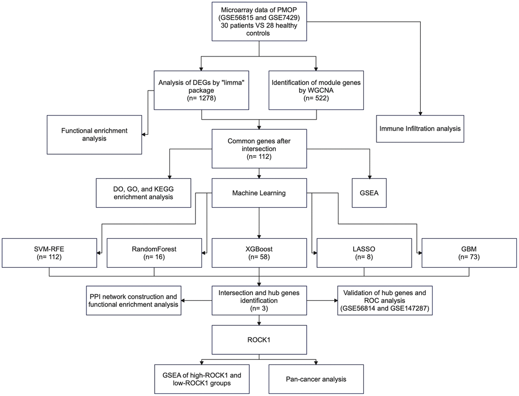 In this study (Figure 1), we utilized the Gene Expression Omnibus (GEO) database to download the mRNA expression datasets GSE56815 and GSE7429 from PMOP patients and identified differential expression genes (DEGs). By employing the cross-disciplinary tools of WGCNA and Machine Learning, we further screened for hub genes common with DEGs. To elucidate key biological functions and pathways related to PMOP, we conducted functional enrichment analyses using GO, KEGG, and GSEA. Additionally, we validated the expression and diagnostic values of hub genes in PMOP using external datasets GSE56814 and GSE147287. Furthermore, we assessed the immune infiltration levels in PMOP and investigated the correlation between hub genes and immune cell expression. Our pan-cancer analysis revealed the potential involvement of PMOP-related genes in cancer development, progression, and prognosis. This is the first study to apply a combined approach of WGCNA and machine learning to identify potential diagnostic and therapeutic markers for PMOP, explore the mechanism of its immune response involvement in pathogenesis, and evaluate the functional significance of candidate genes at the level of pan-cancer. Our findings offer a strong theoretical foundation for future development of novel gene or molecular therapies for PMOP and provide new insights into a potential association between PMOP and cancer.