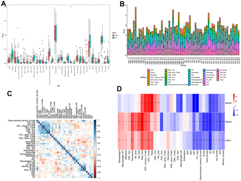 According to the above GSEA results for 112 overlapped genes, three hub genes, and low-ROCK1 group genes, both the GO and KEGG functional enrichment analyses showed a probable association between immunization and PMOP, such as “innate immune response in mucosa”, “adaptive immune response”, “lymphocyte-mediated immunity”, and “primary immunodeficiency”. We then perform an immune infiltration analysis by xCell to find the content and effect of 33 immune cell types on PMOP. As shown in Figure 10A, DCs (Dendritic cells), cDCs (conventional DCs), iDCs (immature DCs), and NKT (Natural Killer T) cells were elevated (p <0.05) while Basophils and Mast cells show a significant decrease (p <0.05 and <0.001, respectively) in PMOP patients. Bar plot showed the different compositions and immune scores of immune cells in each sample (Figure 10B). The correlations between the expression levels of 33 immune cells were calculated. DC had a negative relationship with the T cells family, including Th2 cells, Tgd cells, CD4+ T cells, and CD8+ T cells (Figure 10C). For NKT cells, it was inversely related to Th2 cells but positively related to Th1 cells and Macrophages M2 (Figure 10C). Basophils and Mast cells have a positive correlation with Monocytes and B cells while Mast cells also had a positive association with T cells and Neutrophils (Figure 10C). The correlation between three hub genes and immune cells expression was shown in Figure 10D, and ROCK1 was inversely related to CD4+ TEM (Effector memory T Cells), Macrophages M2, aDC, cDC, iDC, DC, NKT, Th1 cells, naïve B cells, pro B cells, and memory B cells. Conversely, Tgd cells, Mast cells, CD4+ memory T cells, CD4+ T cells, Tregs, CD8+ Tcm, and Th2 cells were negatively correlated with ROCK1 in PMOP patients (Figure 10D).