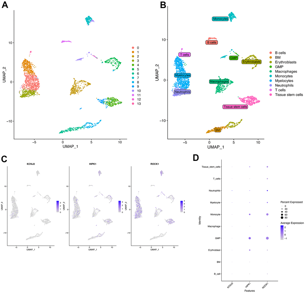 The single-cell RNA sequencing data was from a 67-year-old postmenopausal woman’s bone marrow derived mononuclear cells (BM-MNCs). The UMAP (Figure 11A) showed the 13 clusters of whole cells after dimension and clustering. We then used the “SingleR” package to annotate the 13 clusters into biological cell types, and the 13 clusters were B cells, BM (Bone Marrow), Erythroblasts, GMP (Ganulocyte-Monocyte Progenitor), Macrophages, Monocytes, Myelocytes, Neutrophils, T cells, and Tissue stem cells (Figure 11B). The distribution of three hub genes (KCNJ2, HIPK1, ROCK1) in each cluster was shown in Figure 11C by feature plot. As shown in Figure 11D, ROCK1 was highly expressed in Neutrophils, and the percent expressed of ROCK1 seemed more in GMP and Monocytes.