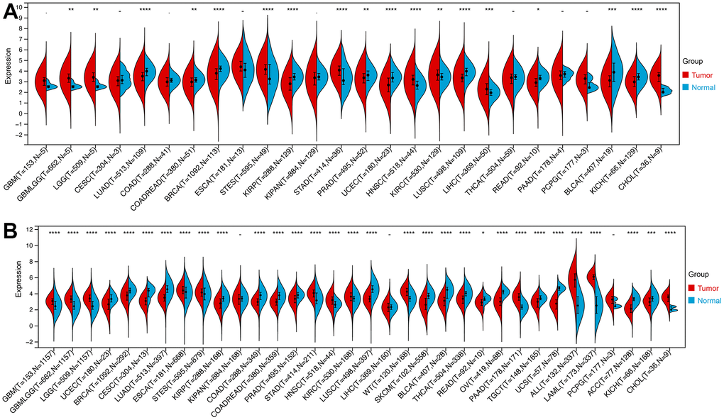 We explore the relationship between the gene expression levels and clinical staging of pan-cancer, including T stage, N stage, M stage, Stage, and Grade. The difference in gene expression in each tumor sample from various clinical stages was calculated using R software (version 4.2.2), and the significance of the difference between pairs was analyzed using the unpaired Student’s t-Test and multiple groups of samples using the analysis of variance.